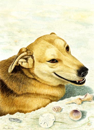 Sparkles Matted Open Edition Mini Print of an original Drew Strouble dog art watercolor painting of a Golden Retriever/German Shepherd Mix Heroic Guide Dog at Siesta Key beach in Florida with sea shells. Open Edition Mini Prints. Overall size: 9 3/4" x 11 5/8" incl. 2" mat. Each print is hand signed and titled. All prints are shrink wrapped with a white mat and foamcore backing.