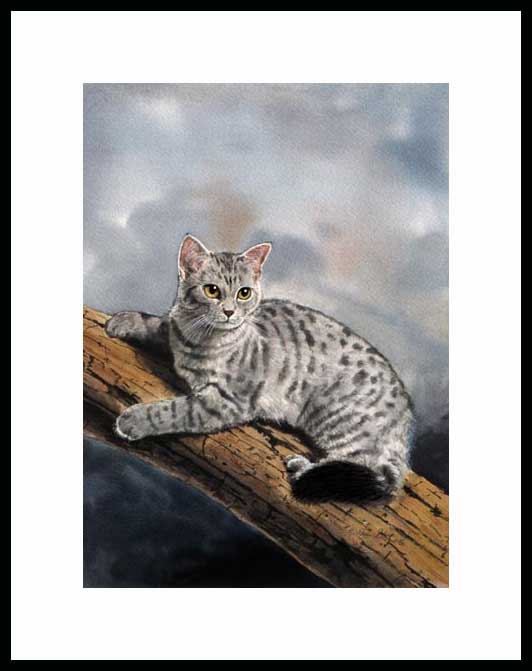 Spotted Sky Framed Open Edition Mini Print of an original Drew Strouble cat art watercolor painting of a silver Bengal cat against a silver sky. Open Edition Mini Prints ¥ Overall size: 9 3/4" x 11 5/8" incl. 2" mat. ¥ Each print is hand signed and titled. All prints are shrink wrapped with a white mat and foamcore backing. Designer Frames are black aluminum with plexiglas.