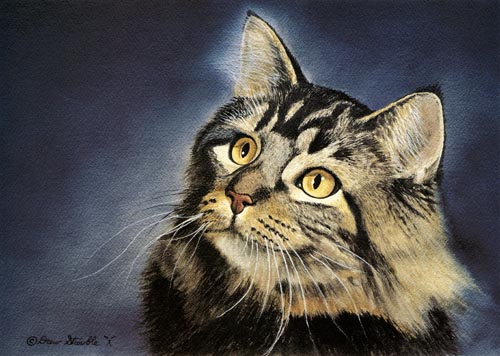 Starlight Matted Limited Edition of an original Drew Strouble cat art watercolor painting of a classically beautiful Maine Coon Cat gazing upward. Limited Edition of: 950 Prints. ¥ Overall size: 14 1/2" x 18" incl. 2 1/2" mat. ¥ Each print is hand signed, titled & numbered with matching Certificate of Authenticity. All prints are shrink wrapped with a white mat and foamcore backing.