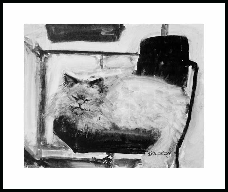 Studio Companion Framed Limited Edition of an original Drew Strouble cat art ink and wash painting of a Himalayan Cat. Limited Edition of: 950 Prints. ¥ Overall size: 17 1/2" x 20 1/2" incl. 2 1/2" mat. ¥ Each print is hand signed, titled & numbered with matching Certificate of Authenticity. All prints are shrink wrapped with a white mat and foamcore backing. Designer Frames are black aluminum with plexiglas.