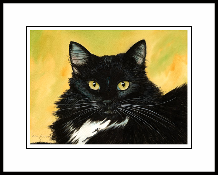 Framed Open Edition Mini print of an original Drew Strouble cat art painting of wonderfully whimsical and very colorful cats. Overall size: 9 3/4" x 11 5/8" incl. 2" mat. Each print is hand signed and titled. All prints are shrink wrapped with a white mat and foamcore backing. Black frames are high quality extruded anodized aluminum with plexiglas for safe shipping.