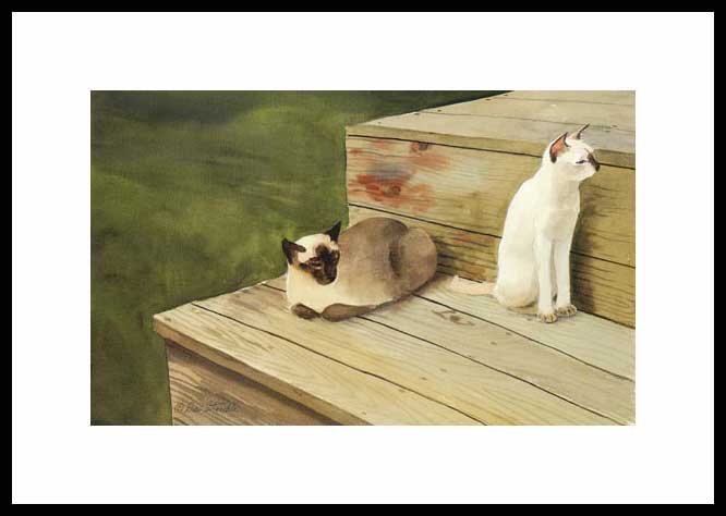 Summer Days Framed Open Edition Mini Print of an original Drew Strouble cat art watercolor painting of a Siamese Kitten and a Seal Point Siamese Cat. Open Edition Mini Prints ¥ Overall size: 10" x 13" incl. 2" mat. ¥ Each print is hand signed and titled. All prints are shrink wrapped with a white mat and foamcore backing. Designer Frames are black aluminum with plexiglas.