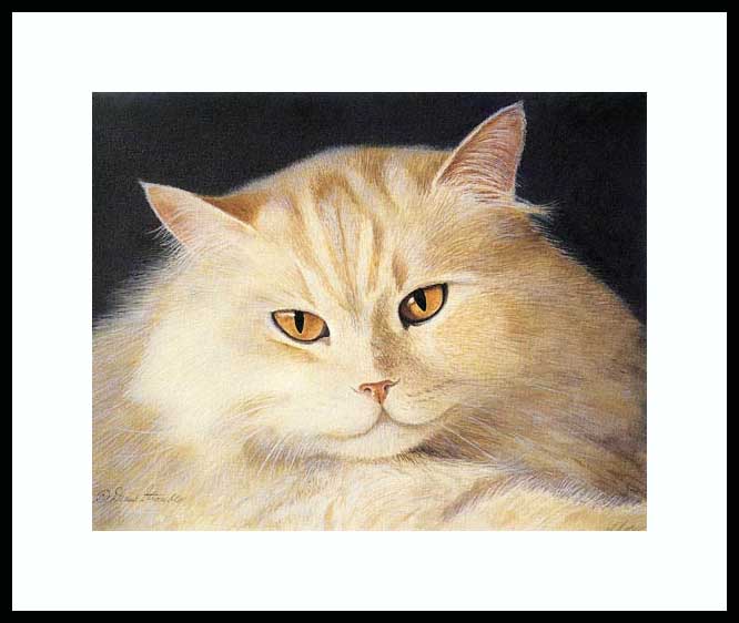 Sunshine Framed Artist's Proof of an original Drew Strouble cat art painting of a sweet-faced Creme Persian Cat. Limited Edition of: 50 Artist's Proofs ¥ Overall size: 14" x 16 3/8" incl. 2 1/2" mat. ¥ Each print is hand signed, titled & numbered with matching Certificate of Authenticity. All prints are shrink wrapped with a white mat and foamcore backing. Designer Frames are black aluminum with plexiglas.