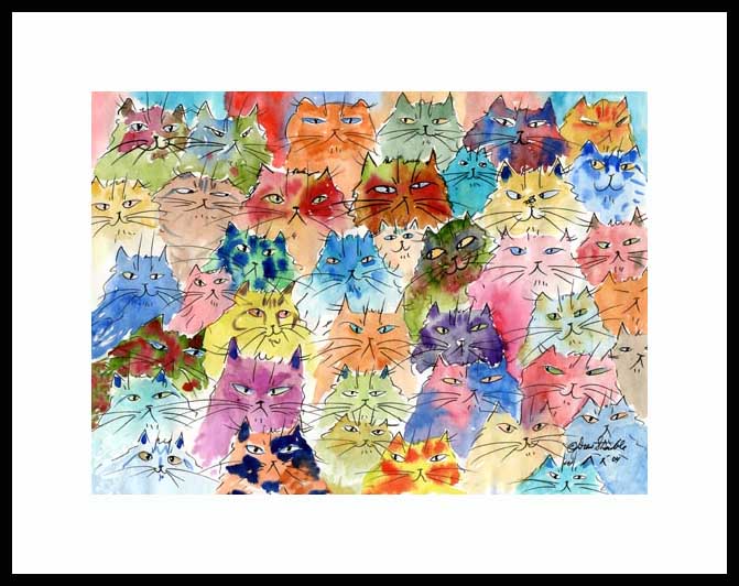 Take Your Pick Framed Artist's Proof of an original Drew Strouble cat art watercolor painting of many multi-colored whimsical cat faces in rainbow hues.