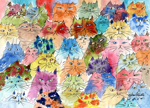 Take Your Pick Matted Limited Edition of an original Drew Strouble cat art watercolor painting of many multi-colored whimsical cat faces in rainbow hues.