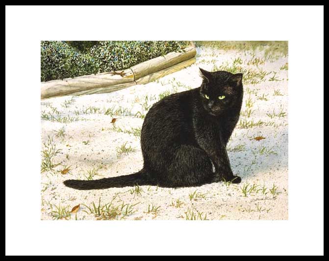 T.C. Framed Artist's Proof of an original Drew Strouble cat art watercolor of a Black Cat. Limited Edition of: 50 Artist's Proofs. Overall size: 14 1/2" x 18" incl. 2 1/2" mat. Each print is hand signed, titled & numbered with matching Certificate of Authenticity. All prints are shrink wrapped with a white mat and foamcore backing. Designer Frames are black aluminum with plexiglas.