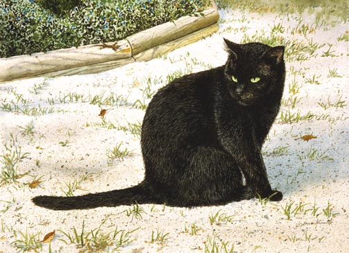 T.C. Card of an original Drew Strouble cat art watercolor of a Black Cat. Fine Art Greeting Card. Hand mounted Art Print on 5" x 7" white card. Blank inside. Matching envelope and clear protective packet included.