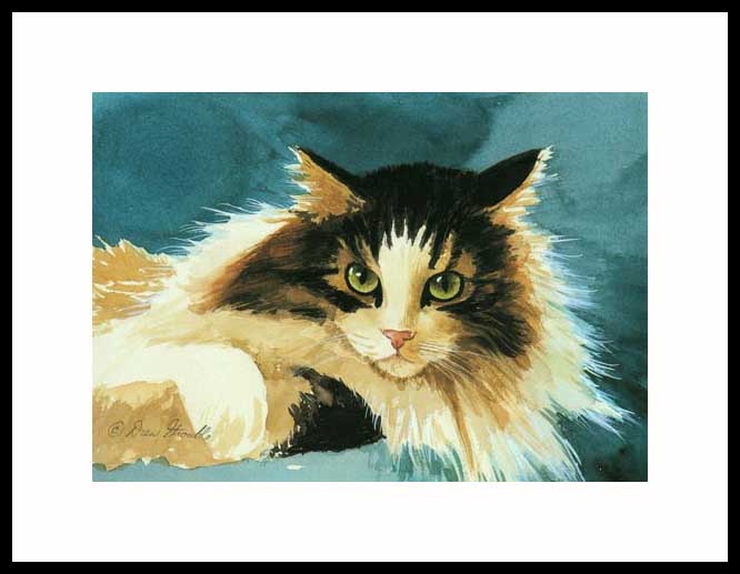 Temptress Matted Open Edition Mini Print of an original Drew Strouble cat art watercolor painting of a long-haired Calico Norwegian Forest cat. Open Edition Mini Prints. Overall size: 8 7/8" x 10" incl. 2" mat. Each print is hand signed and titled. All prints are shrink wrapped with a white mat and foamcore backing.