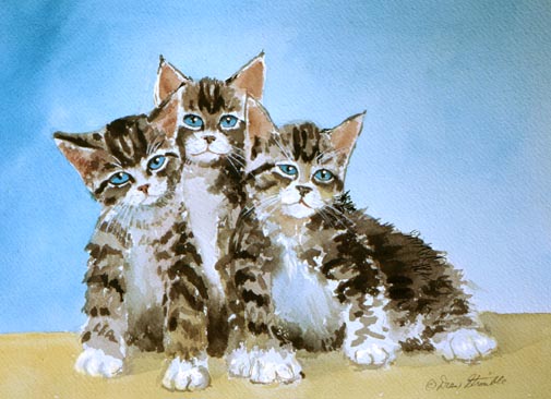 Three Kittens Matted Open Edition Mini Print of an original Drew Strouble cat art watercolor painting of three adorable Tabby kittens in the traditional watercolor style. Open Edition Mini Prints. Overall size: 9 3/4" x 11 5/8" incl. 2" mat. Each print is hand signed and titled. All prints are shrink wrapped with a white mat and foamcore backing.