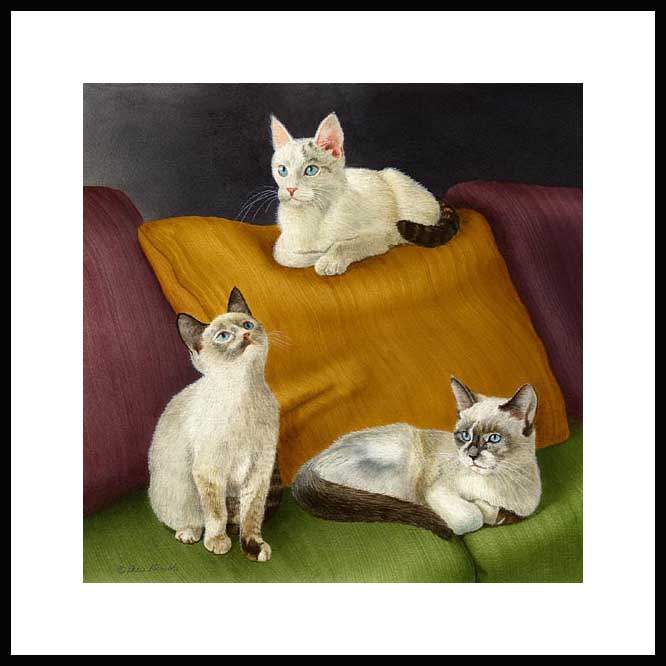 Hi Drew, Coincidentally, we have a male seal point Siamese named Rocky! These will make a total of 6 of your Siamese prints we have. I was excited to find color ink prints in a shop in Siesta Key while on vacation in Sarasota in June this year. We first heard of you on our vacations over the years there. We have 3 seal point Siamese: Rocky and siblings Toby and Macy. "Meezers" has a particular place of honor on our mantel over the fireplace and is my favorite. Love your Meezers! Thanks, Drew. -Renee