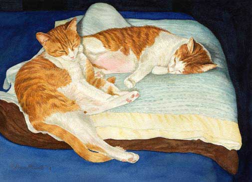 Time Out Card of an original Drew Strouble cat art watercolor painting of two orange and white tabby cats sleeping together on a folded blanket on a bed. Fine Art Greeting Card I Hand mounted Art Print on 5" x 7" white card. I Blank inside. I Matching envelope and clear protective packet included