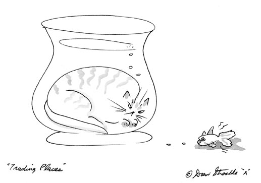 Trading Places card. Hand mounted Art Card of an original Drew Strouble cat art ink and wash drawing of a cat in a fishbowl looking outside at a fish. Fine Art Greeting Card • Hand mounted Art Print on 5" x 7" white card. • Blank inside. • Matching envelope and clear protective packet included.