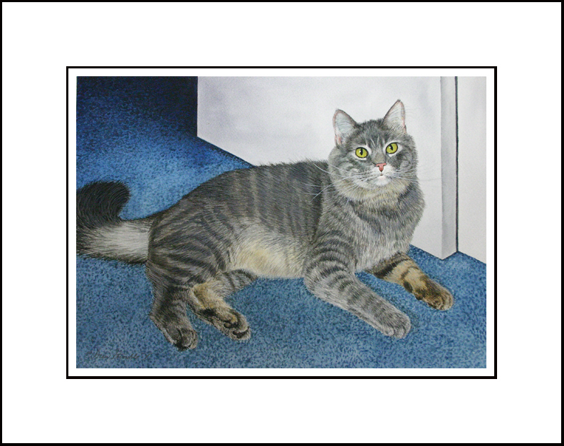 Vincent - Fine Art Greeting Card • Hand mounted Art Print on 5" x 7" folded white card stock. • Blank inside. • Matching envelope and clear protective packet included. Image depicts of a very handsome classic gray tabby cat named Vincent.