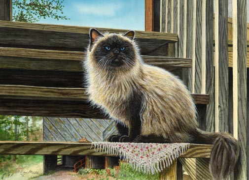 Waiting for Tom Matted Artist's Proof of an original Drew Strouble cat art watercolor painting of a Seal Point or Chocolate Point Himalayan cat waiting outside on wooden steps.