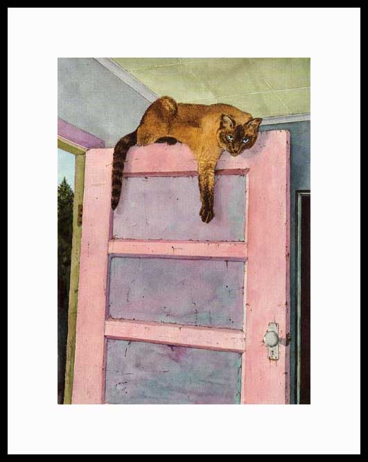 Waiting for Prey Framed Open Edition Mini Print of an original Drew Strouble cat art watercolor painting of a Chocolate or Seal Point Siamese Cat perched atop a door. Open Edition Mini Prints. Overall size: 9 3/4" x 11 5/8" incl. 2" mat. Each print is hand signed and titled. All prints are shrink wrapped with a white mat and foamcore backing. Designer Frames are black aluminum with plexiglas.