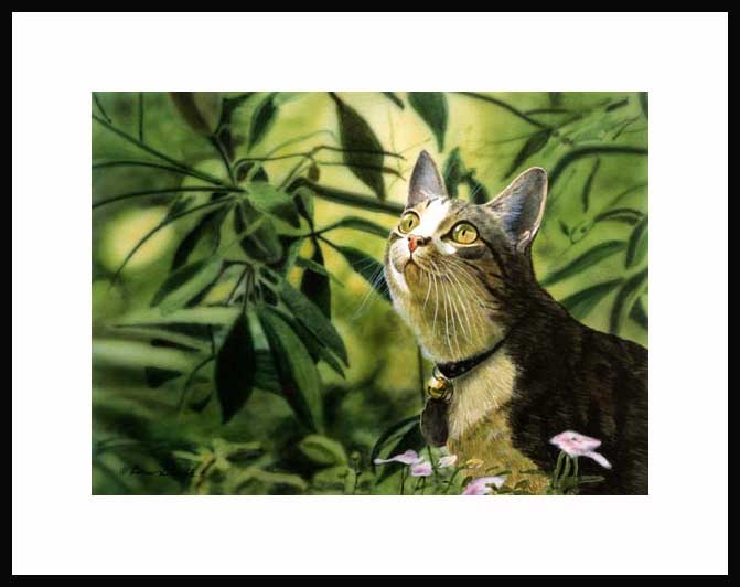 The Warning Bell Framed Artist's Proof an original Drew Strouble cat art watercolor painting of a Tabby Cat with a bell on its collar and a green background. Limited Edition of: 50 Artist's Proofs. Overall size: 14 1/2" x 18" incl. 2 1/2" mat. Each print is hand signed, titled & numbered with matching Certificate of Authenticity. All prints are shrink wrapped with a white mat and foamcore backing. Designer Frames are black aluminum with plexiglas.