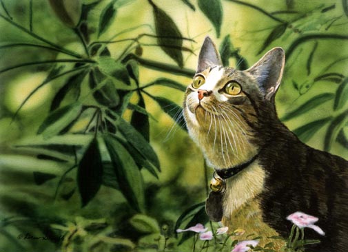 The Warning Bell Matted Open Edition Mini Print an original Drew Strouble cat art watercolor painting of a Tabby Cat with a bell on its collar and a green background.. Open Edition Mini Prints. Overall size: 9 3/4" x 11 5/8" incl. 2" mat. Each print is hand signed and titled. All prints are shrink wrapped with a white mat and foamcore backing.