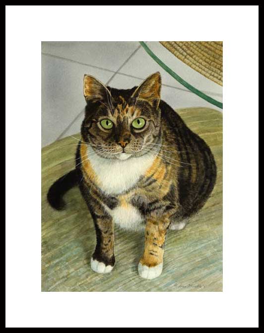 What's for Dinner? Framed Open Edition Mini Print of an original Drew Strouble cat art watercolor painting of a pleasingly plump Tabby Calico Cat mix. Open Edition Mini Prints. Overall size: 9 3/4" x 11 5/8" incl. 2" mat. Each print is hand signed and titled. All prints are shrink wrapped with a white mat and foamcore backing. Designer Frames are black aluminum with plexiglas.