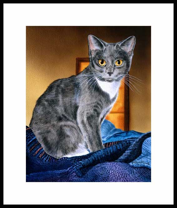 Who, Me? Framed Open Edition Mini Print of an original Drew Strouble cat art watercolor painting of Gray and White Cat. Open Edition Mini Prints. Overall size: 9 3/4" x 11 5/8" incl. 2" mat. Each print is hand signed and titled. All prints are shrink wrapped with a white mat and foamcore backing. Designer Frames are black aluminum with plexiglas.