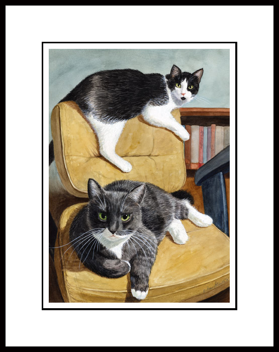 Framed Mini Print of an original Drew Strouble cat art painting of two wonderful domestic bi-color cats on a chair. Hand signed and titled by the artist. The overall size 9 3/4 x 11 5/8 inches. White mat backed with foamcore backing, high quality black aluminum frame with plexiglas for safe shipping.