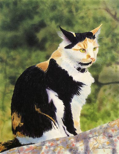 Wind Whisper Matted Open Edition Mini Print of an original Drew Strouble cat art watercolor painting of a beautiful Calico Cat. Open Edition Mini Prints. Overall size: 8 7/8" x 10" incl. 2" mat. Each print is hand signed and titled. All prints are shrink wrapped with a white mat and foamcore backing.