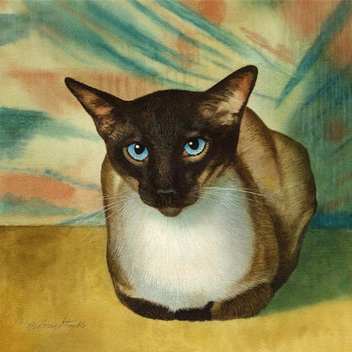 Hi Drew, Coincidentally, we have a male seal point Siamese named Rocky! These will make a total of 6 of your Siamese prints we have. I was excited to find color ink prints in a shop in Siesta Key while on vacation in Sarasota in June this year. We first heard of you on our vacations over the years there. We have 3 seal point Siamese: Rocky and siblings Toby and Macy. "Meezers" has a particular place of honor on our mantel over the fireplace and is my favorite. Love your Meezers! Thanks, Drew. -Renee